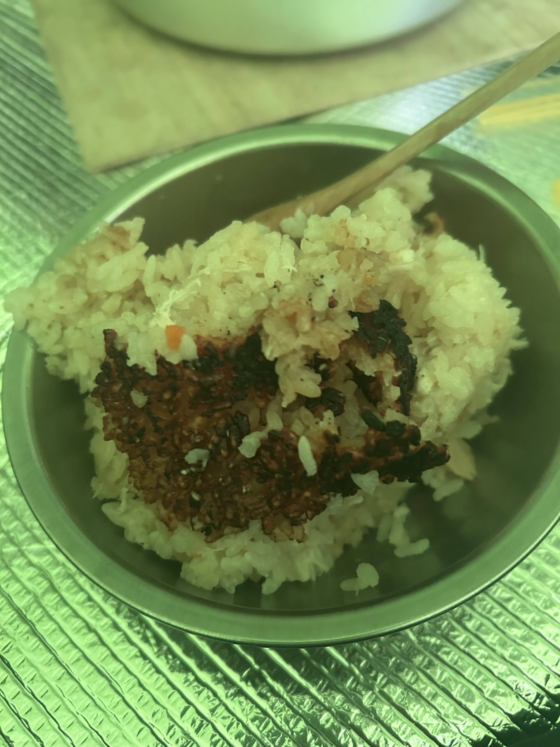 初日のご飯は、チキン&ベーコン炊き込みご飯。ダイナミックなおこげ。