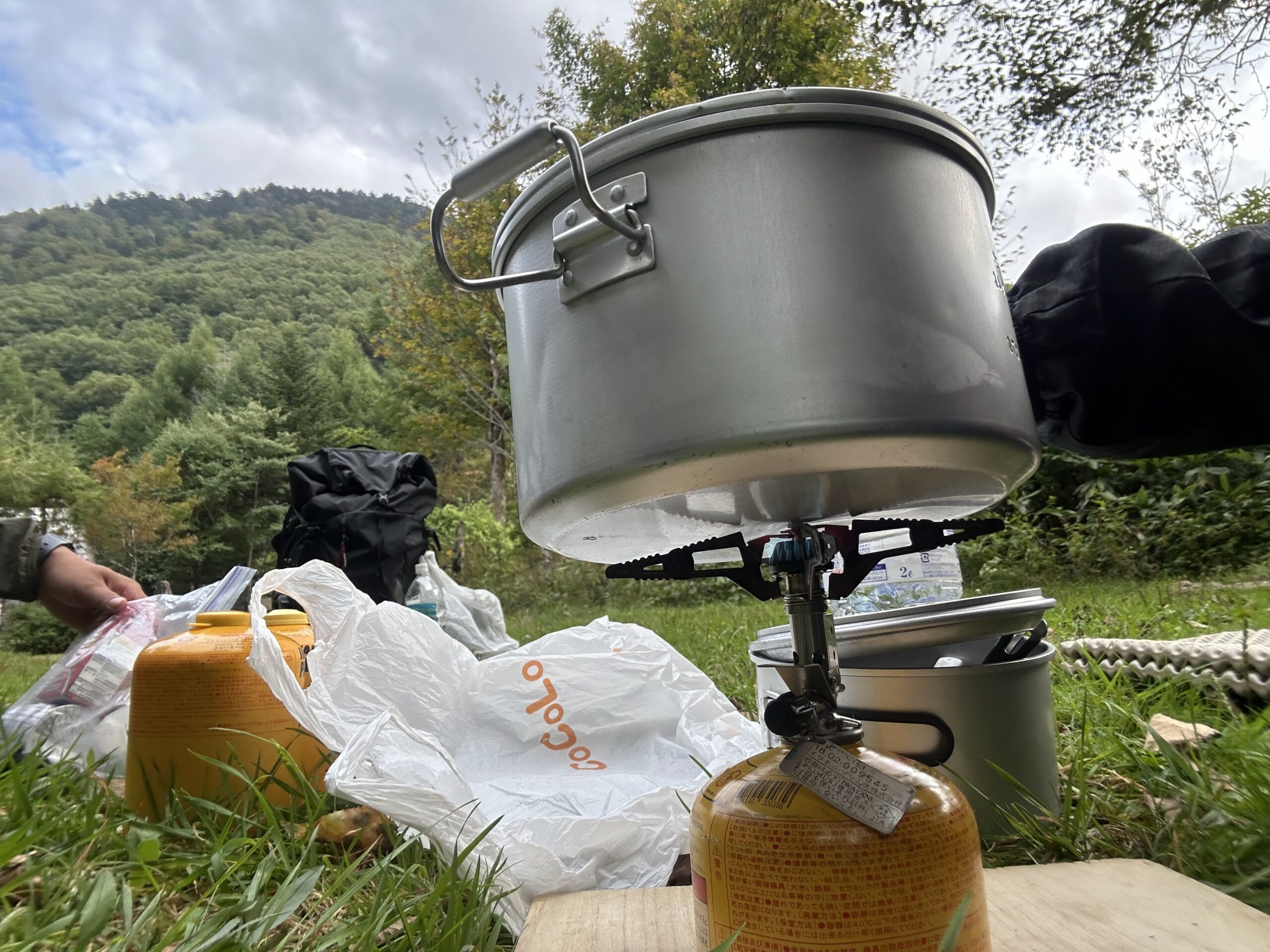 高速バスで新宿から新穂高温泉へ。林道を1時間ほど登って最初のキャンプ地へ。